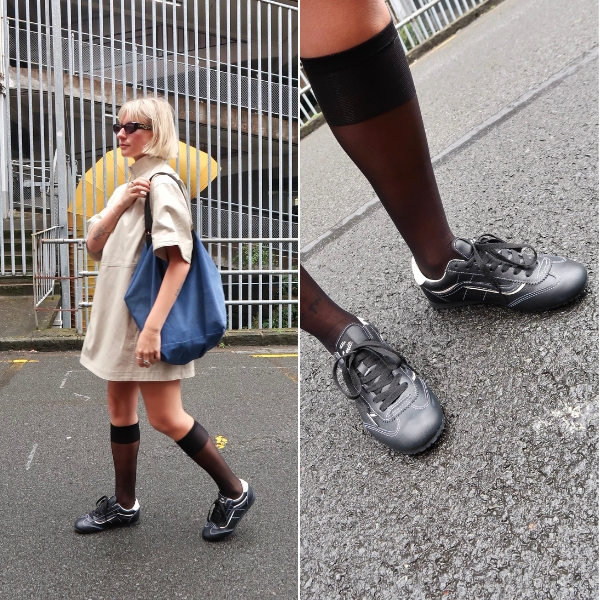 I was really drawn to the sleekness of the Black/Black variation of the Vans Super Lowpro — it felt like a smart-casual take on an everyday, sport-inspired sneaker. To elevate it further, I leaned into the sleek upper with a matching leather dress, while the addition of knee-high sheer socks nodded to its running roots. A Mary Poppins-sized bag in cobalt blue added a playful pop, and of course, sleek black shades completed my shopping OOTD.