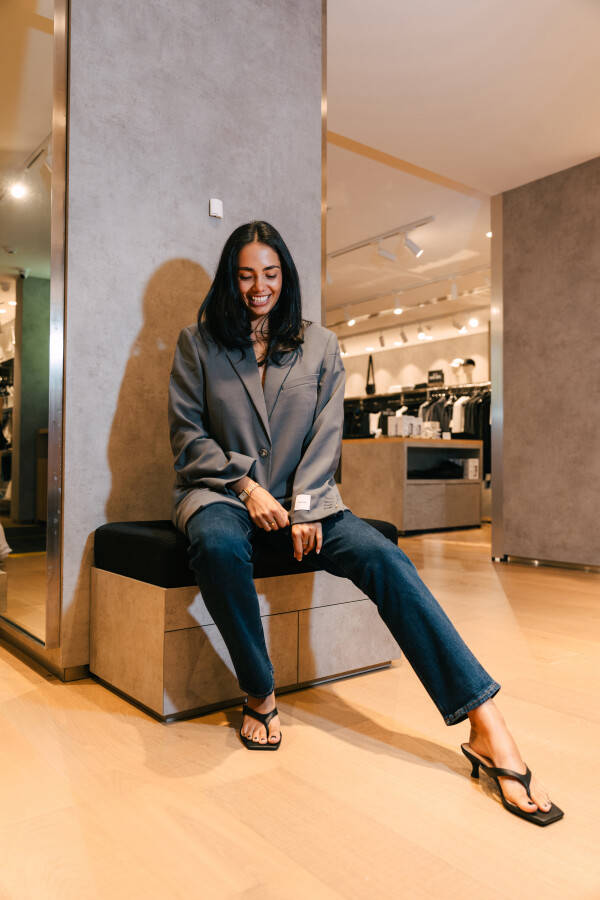 Maya is often busy attending events or catching up with friends post-work, so for her second look, I paired the '90s Straight Leg Jean in a deeper wash with an oversized grey blazer, intentionally styled with nothing underneath—perfect for letting CK lingerie peek through. Finished with a chic pair of jandal heels, this look effortlessly ticks the box for smart-casual occasions.