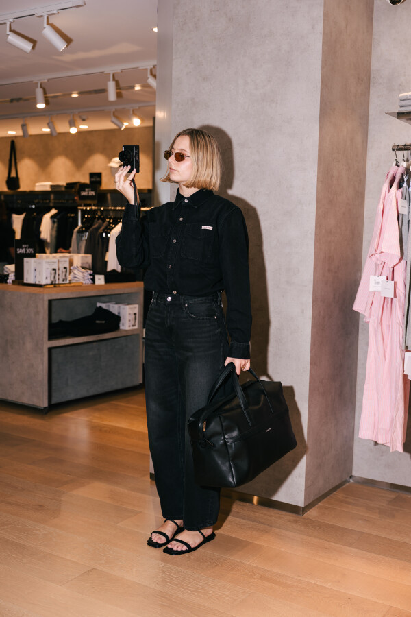 For the next look, knowing Brooklyn's affinity for barrel-leg jeans, I styled her in the Relaxed Barrel Jeans in the Evening Black wash. We then headed into the menswear section, where I had spotted the '90s Denim Overshirt in a similar wash. With the shirt tucked into the jeans, leather slides on her feet, an overnight bag in her arm, and shades on, our head-to-toe monochrome look was complete—perfect for on-the-go errands and spontaneous plans.