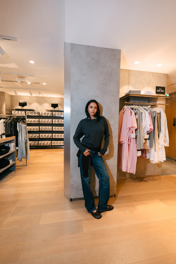 For Tima, a busy working mum of three and content creator, her go-to style calls for a touch of practicality while still maintaining an empowered, feminine energy. She immediately gravitated towards the Low-Rise Baggy jeans in the Vintage Oceania wash—a classic, lighter blue denim shade.