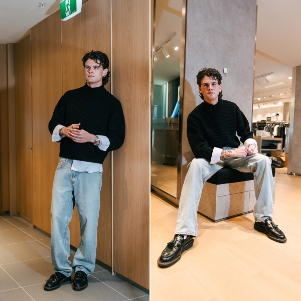 Jeans first—the '90s Tapered Jeans captured the put-together yet relaxed aesthetic I was after. Paired with a crisp white button-down, we had our base locked in. In keeping with Josh's signatures, we borrowed the women's Ribbed Chunky Relaxed Turtleneck Jumper to create a cropped finish on his 6'2" frame. With a deft tuck to reveal the shirt cuff, and his leather loafers kept on, his preppy, Prince William-inspired look was complete.