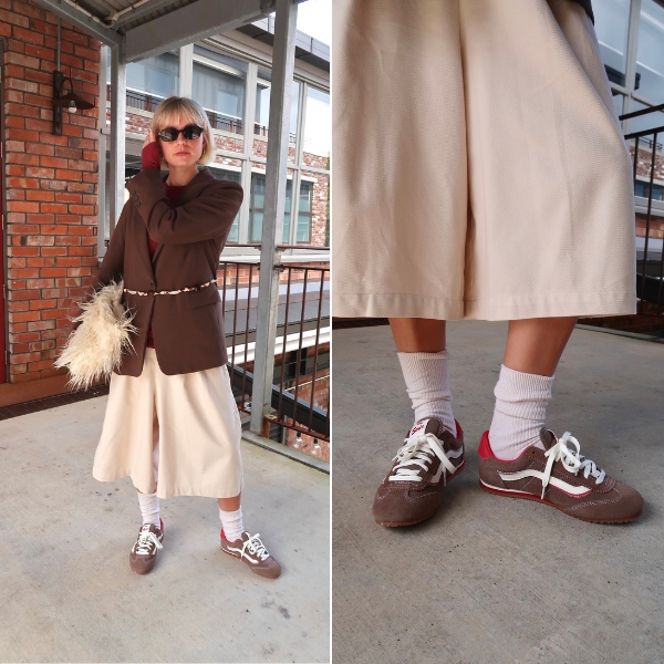 First off the mark: Walnut. I’m a firm believer in (and advocate for) the styling sandwich theory — matching your shoes by echoing their colour or texture elsewhere in your outfit, like your top or accessories. Here, I mirrored the Walnut base of the Vans Super Lowpro with a brown blazer and picked up on the red accents of the sneaker through my knit underneath. I chose a cream pair of longline shorts to anchor the look and give a subtle nod to Vans’ skate legacy. A fluffy bag for a Martha-coded finish — and voilà, my first look is complete. Perfect for errands and the office alike.