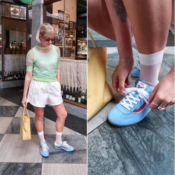 For my third and final Vans Super Lowpro look, I leaned into the retro sports revival, pairing the Heritage Blue colourway with pieces that channelled a heritage sport feel: leather shorts, a singlet layered under a sheer shirt, and a nylon handbag. While perhaps not track-ready, it’s weekend-perfect — delivering pops of colour, comfort, and my signature touch of personal style.