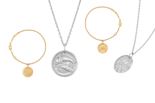 Pictured right to left: Zodiaque bracelet Scorpii (Scorpio), Zodiaque medal Piscium (Pisces), Zodiaque bracelet Arietis (Aries), Zodiaque medal Aquarii (Aquarius)
