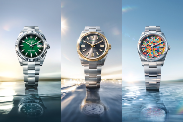Curiosity with colour seems to be a through-line for this year’s releases, with seven new timepieces from Rolex all considering how colour can both fold into the everyday or rise for a special occasion. A new Oyster Perpetual 41 consecrates 100 years of watchmaking achievements—a very clever collectors edition (read: possibly impossible to get one’s hands on) offered in an unprecedented configuration that expresses with strength, simplicity and elegance, the quintessence of a watch according to Rolex. This holds its own alongside the Oyster Perpetual 36 with a multicoloured lacquer dial decorated with the Jubilee motif and the emblematic Rolex Green of the Oyster Perpetual Datejust 41.